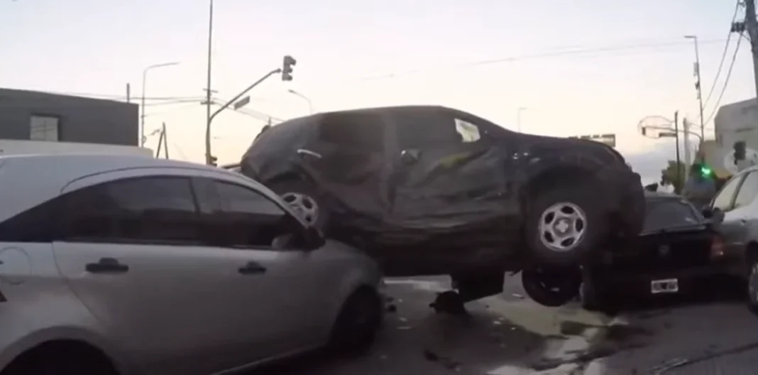 Allí, por causas que se investigan chocaron siete vehículos, una camioneta Ford Eco Sport quedó arriba de dos automóviles y uno de los rodados quedó sobre la vereda.